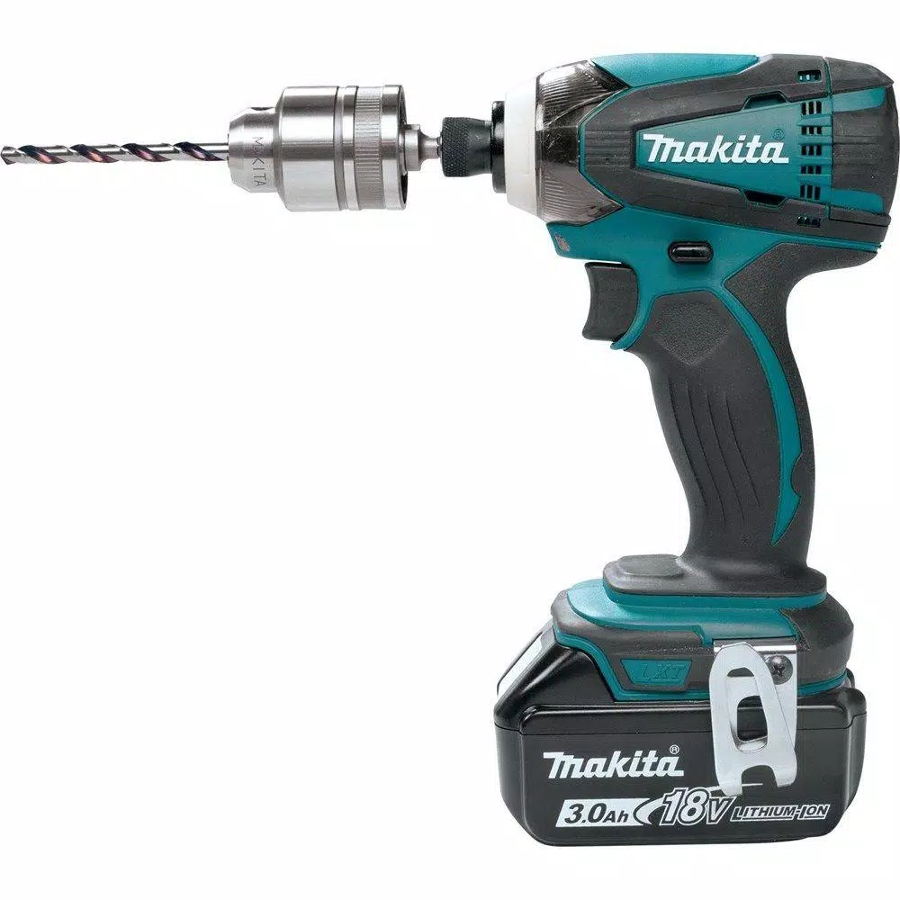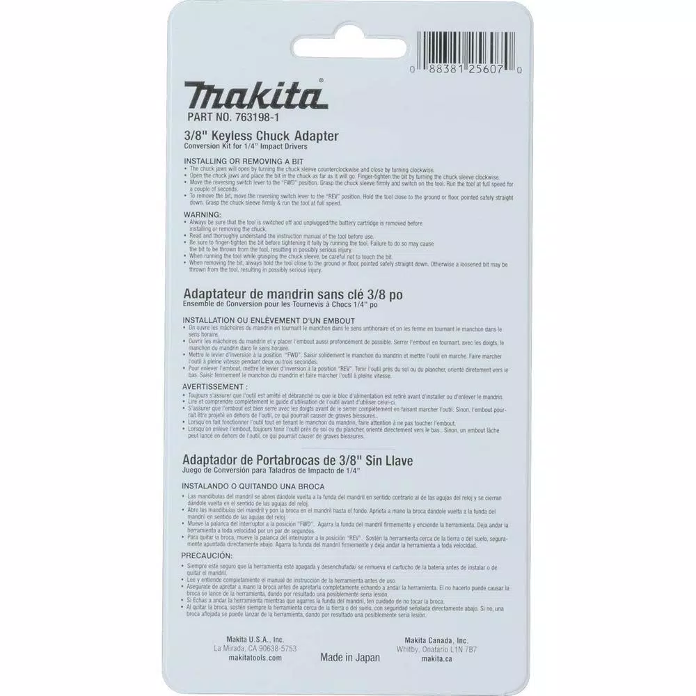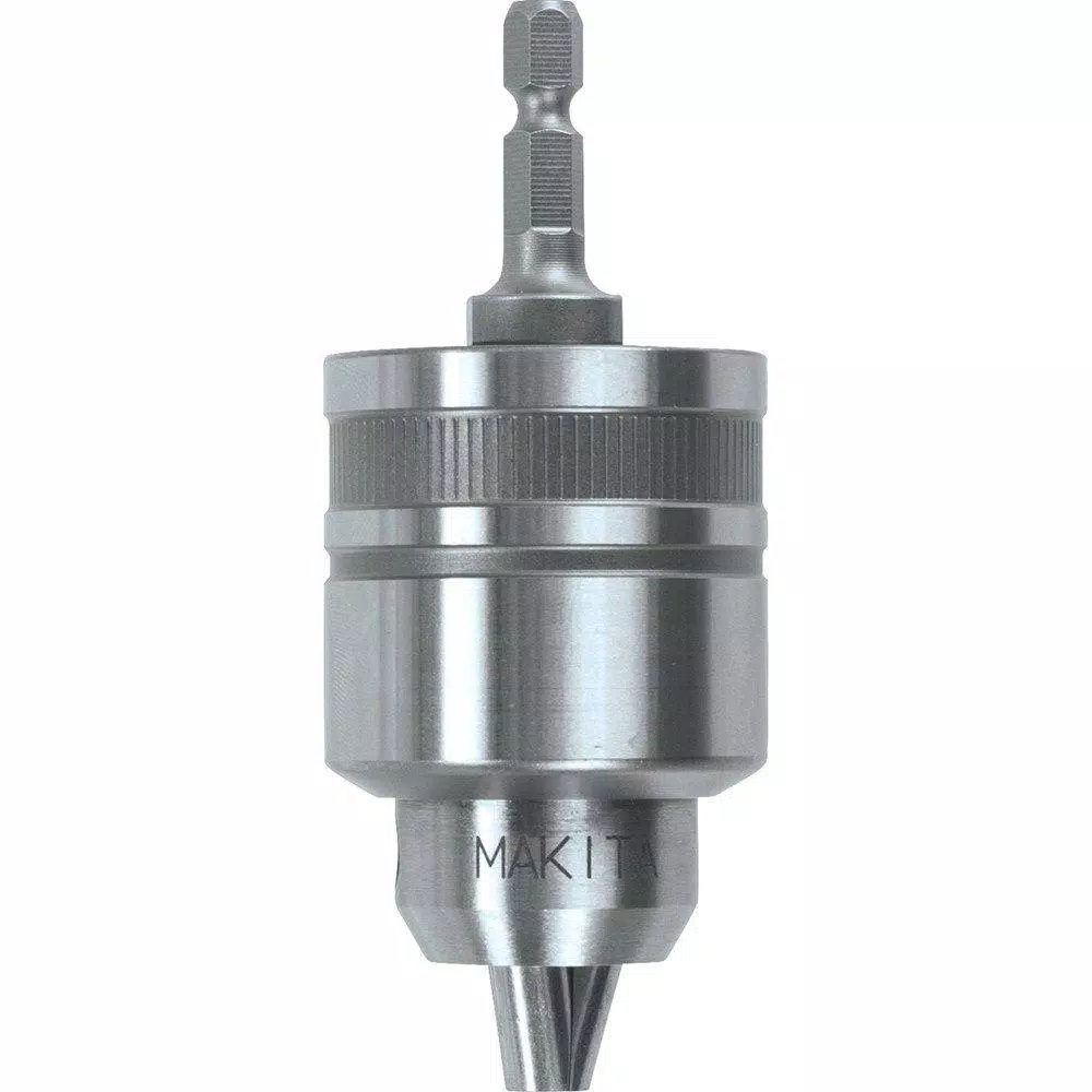 The Makita 3/8 in. Metal Impact Driver Keyless Chuck is a drill attachment that is made from metal. This chuck can convert an impact driver into a driver drill. It accepts round and hex shank bits.