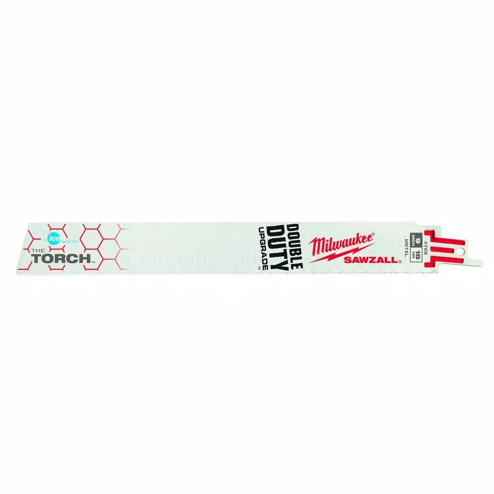 The Milwaukee 48-00-4788 9 in. x 18 TPI The Torch metal-cutting blades with the Double Duty Upgrade feature a tooth form optimized for the longest life and maximum durability. Tough Neck is engineered to protect against tang breakage and delivers the strongest SAWZALL blade tang on the market. Grid Iron features a stamped honeycomb pattern throughout the body of the blade that greatly increases the rigidity of the blade, making it the stiffest metal cutting SAWZALL blade on the market. Ice Hardened blades are cryogenically treated for up to 50% longer life. These blades are ideal for making tough, straight cuts. The Milwaukee 48-00-4788 contains 5 blades.