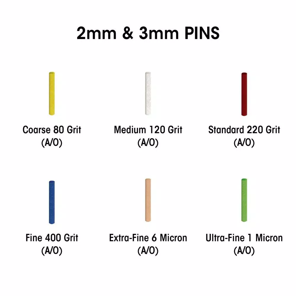 - Assorted set ideal starter set, this 49-piece assortment contains eight 2 mm pins in each grit/color with a 2 mm mandrel, coarser grits for light deburring and cleaning, standard grits for smoothing, and finer grits for finishing and polishing