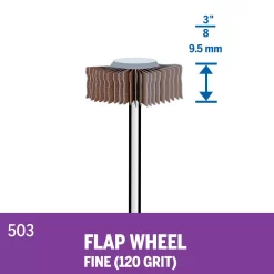 The Dremel 3/8 in. Grit Flap Wheel continuously exposes new abrasives to prevent clogging and to provide a uniform finish. Ideal for grinding and polishing flat and contoured surfaces.
