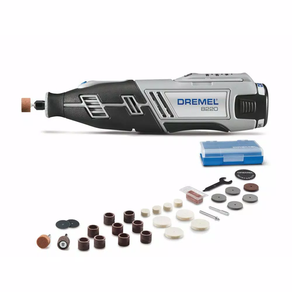 An EZ Lock mandrel, EZ Lock cut-off wheels and the handy collet fan are part of this 130-Piece kit filled with genuine Dremel accessories. Offering reusable storage bins and lift-out trays for easy organization of the included bits, this kit is ready for cutting, grinding, polishing, sanding, cleaning and more. The kit also includes sanding bands, sandpaper discs, polishing compound, felt polishing wheels, aluminum oxide grinding stones, silicon carbide grinding stone, mandrels, wire brush, wrench and a reusable carrying case with clear lid. The Dremel 8220 variable-speed cordless rotary tool offers the highest performance and versatility of all Dremel cordless rotary tools. The strength of its motor facilitates maximum performance at all speed levels. The ability to use all current Dremel rotary tool accessories and attachments let the Dremel 8220 complete a wide range of projects. A slim ergonomic body provides a 360° grip zone for control in any position. Powered by 12-Volt MAX Lithium-Ion battery technology, the Dremel 8220 has a 33% longer run-time than the Dremel 8200 cordless rotary tool when cutting screws.