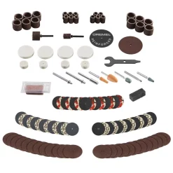 This kit contains 110 Genuine Dremel accessories to accomplish most any job. This versatile and re-usable accessory kit includes everything you need to cut, grind, sand, polish, drill, sharpen, clean and more. Case is reusable. Keep a light touch, letting the speed of the tool do the work. This helps your accessories last longer.