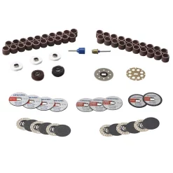 A 100% EZ accessory kit with 70 genuine Dremel accessories that are part of the EZ Lock or Drum system. Offering reusable storage bins and lift-out trays for easy organization of the included bits, this kit is ready for cutting, polishing, sanding, cleaning and more. This EZ kit includes an EZ Lock mandrel, EZ Drum, EZ Lock diamond cutting wheel, EZ Lock carbide cutting wheel, EZ Lock metal cutting wheels, EZ Lock plastic cutting wheels, EZ Lock polishing cloths, EZ Lock sanding discs, EZ Lock sanding buffs, EZ sanding bands and a reusable carrying case with clear lid.