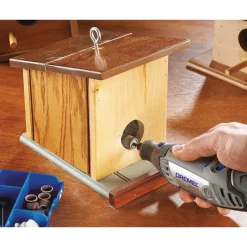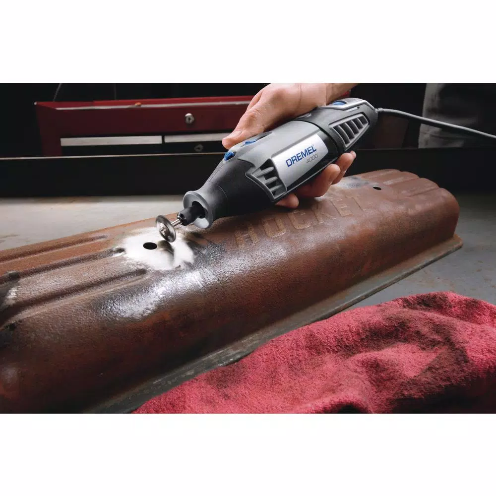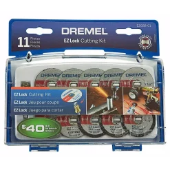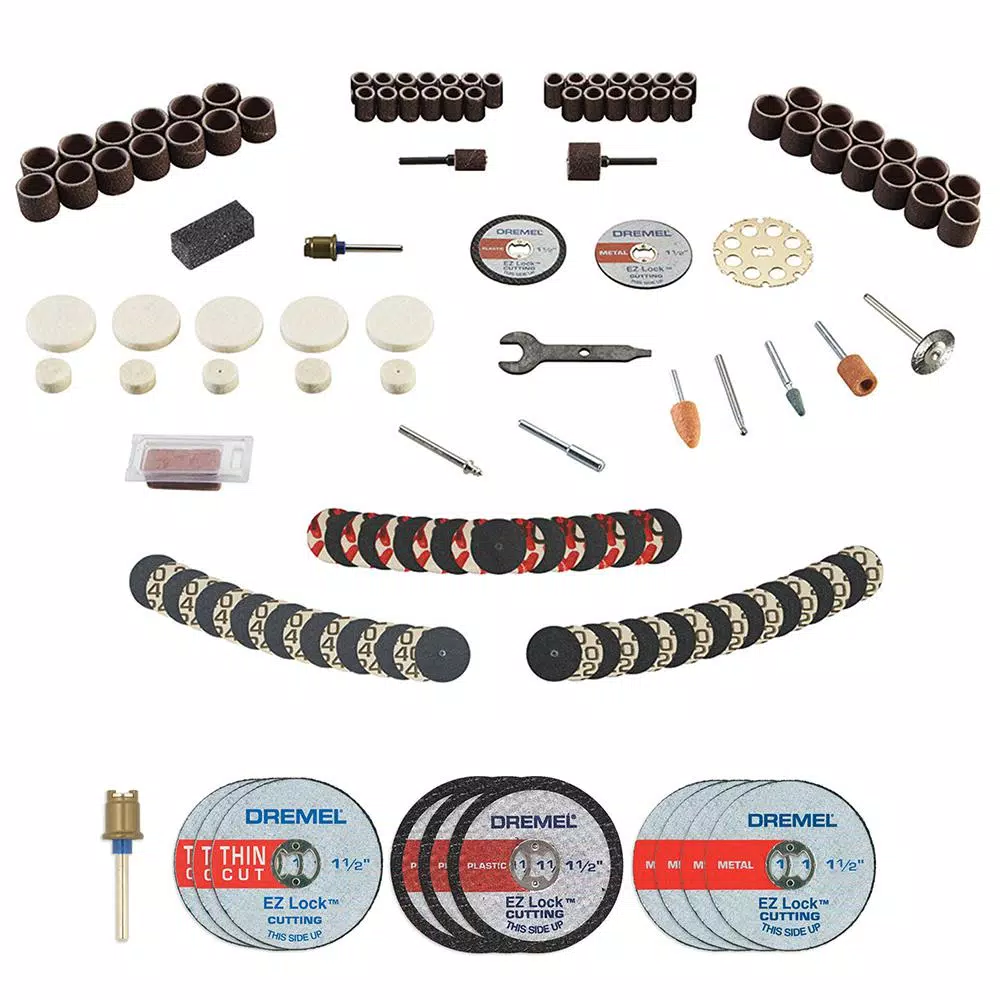 The EZ688-01 contains Dremel EZ Lock cutting wheels that last longer than the regular cut-off wheels. The Dremel EZ Lock system makes accessory changes as easy as pull – twist – release. Contains 10 EZ Lock cut-off wheels, (4 metal-cutting wheels, 3 thin-cut wheels and 3 plastic cutting-wheels), and 1 EZ402 mandrel. The EZ Lock system is compatible with all Dremel Rotary Tools. An EZ Lock mandrel, EZ Lock cut-off wheels and the handy collet fan are part of the 713-01 130-Piece kit filled with genuine Dremel accessories. Offering reusable storage bins and lift-out trays for easy organization of the included bits, this kit is ready for cutting, grinding, polishing, sanding, cleaning and more. The kit also includes sanding bands, sandpaper discs, polishing compound, felt polishing wheels, aluminum oxide grinding stones, silicon carbide grinding stone, mandrels, wire brush, wrench and a reusable carrying case with clear lid.