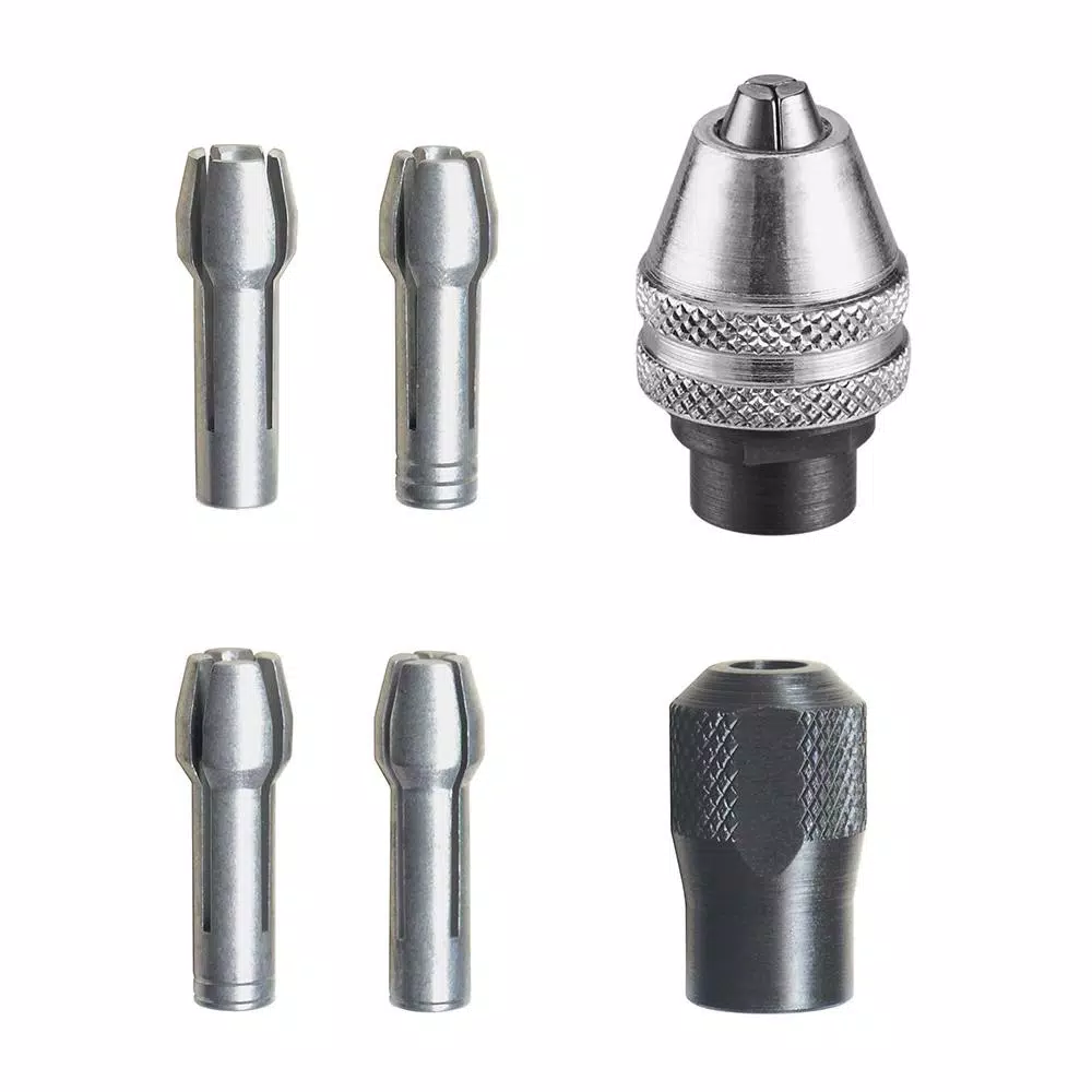 Improve the grip for bits in our rotary tool line with a genuine Dremel collet set. With the 480, 481, 482, 483 collets, plus a quick-change collet nut, you can easily use a wide range of bits. 5-piece set. Now have wrench-free accessory changes. The Keyless Chuck holds accessories without using a collet eliminating having to use a wrench and creating quick and easy accessory changes. Ideal when the application requires numerous accessory changes.