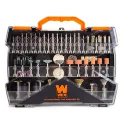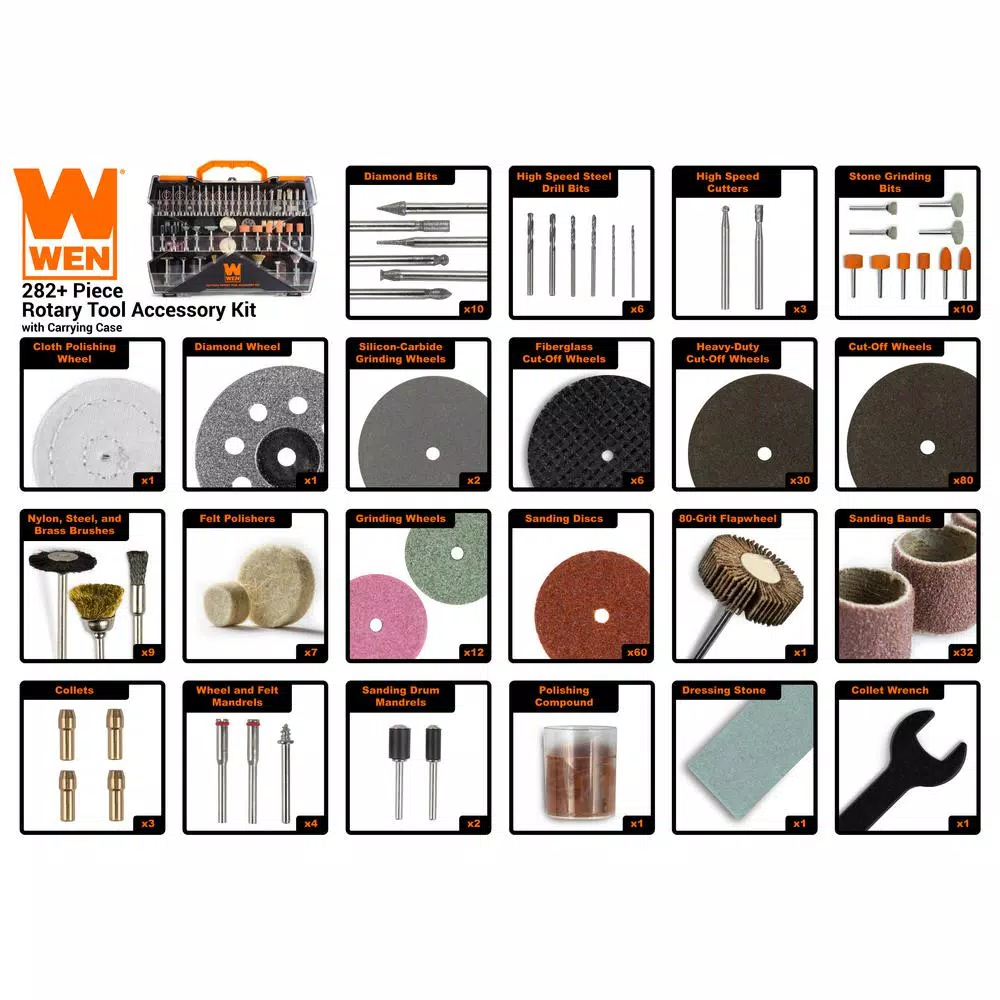 Remember when you had the perfect companion for your WEN Rotary Tool, Grind, polish, cut, engrave, carve, sand and a bunch of other verbs all with the WEN 282-Piece Rotary Tool Accessory Kit. This assortment of bits, discs, brushes, drills and bands comes in an easy-to-organize carrying case, complete with onboard storage slots for each individual bit. Although this kit was created with the WEN rotary tool series in mind, the 1/8 in. shanks allow for compatibility with the majority of rotary tools on the market. This package includes 3 brass brushes, 3 bristle brushes, 3 stainless steel brushes, 10 diamond-coated bits, 6 silicon-carbide grinding discs, 6 aluminum-oxide grinding discs, 6 fiberglass cut-off wheels, 4 silicon-carbide grinding discs with shanks, 6 aluminum-oxide grinding discs with shanks, 6 high-speed drill bits, 3 high-speed cutters, 3 mandrels for cut-off wheels, a mandrel for felt wheels, 7 felt wheels, 32 spindle sanding bands, a rubber grinding wheel, 60 sandpapers, 2 sanding shanks, 80 cut-off wheels, 30 heavy-duty cut-off wheels, 4 collets (2-1/8 in., 3/32 in., 1/16 in.) a diamond-cutting disc, a flap wheel, a dressing stone, a wrench, a cloth wheel and a bottle of polishing compound. Remember when you could take on a variety of projects all with 1 accessory kit, Remember WEN.