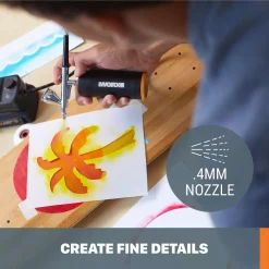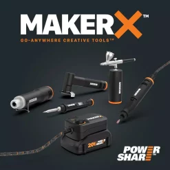 The Worx MAKERX Air Brush is more nimble than other air brushes, due to its slim form factor. But because it’s backed by a 20V battery, it’s actually more powerful, and lasts longer on a single charge. There’s no need for an air compressor, it’s just your MAKERX Air Brush and the Hub going where you go. With its precision 0.4 mm nozzle, it excels at fine, detailed jobs, like tiny crafts of all kinds. Its pressure rating is 14-18psi, and the dual function trigger controls its 7 L flow capacity. It comes with a dropper, spanner wrench, and cleaning brush in the box. MAKERX has created crafting and hobby tools that are smaller, but more powerful—the secret lies in the Hub. It’s a power source that you can take with your tool, so if you want to work in the middle of a large space, you can, and still have the power to get the job done. Thoughtful design allowed Worx engineers to make these tools slimmer, so you can hold them with more precision, and provide a level of detail to your projects that’s not possible with other tools. This model doesn’t come with the MAKERX Hub or a 20V Power Share battery, but that’s by design. Because if you already have a Hub and a battery, there’s no need to buy it again. It’s a great way to save money as you build up your MAKERX tool collection.