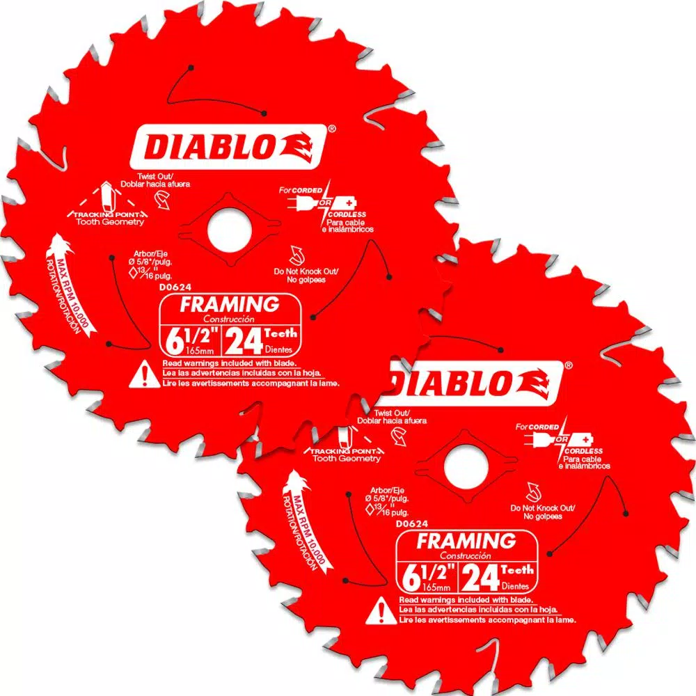 This Diablo 6-1/2 in. Saw Blade produces accurate, smooth cuts on framing materials without bogging down your power tool. Even underpowered circular saws can spin this 24-tooth saw blade with precision thanks to a super-thin kerf that minimizes material removal and produces fast, clean swaths. A Perma-SHIELD nonstick coating reduces drag while stabilizer vents absorb noise and vibration to keep the blade straight on rips and cuts.