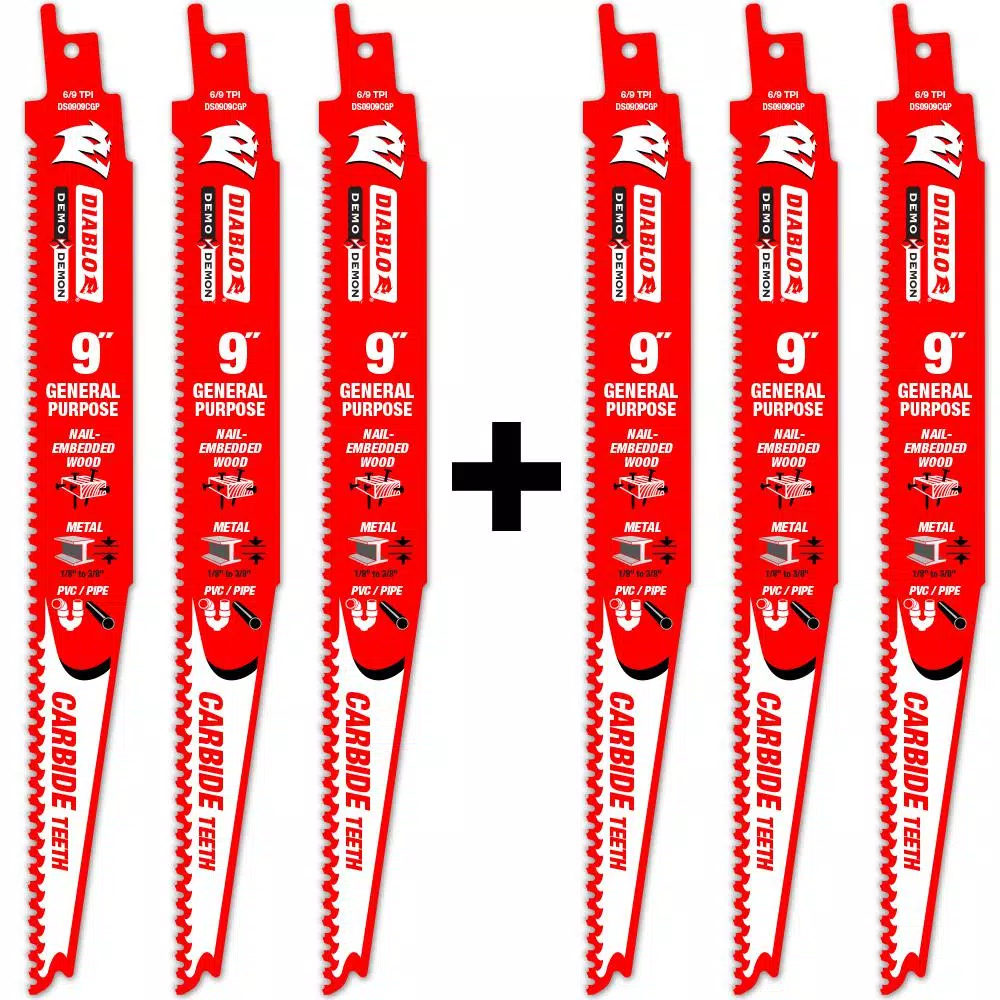 DIABLO new Demo Demon carbide general purpose reciprocating blades are the first on the market specifically designed for both wood and metal. These blades include exclusive features that deliver unmatched 50-times longer life in both wood and metal cutting applications. With an oversized blade body, variable tooth design and PERMA-SHIELD non-stick coating, this blade is ideal for cutting nail-embedded wood and ferrous metal applications with a 3/32 in. to 1/4 in. T.