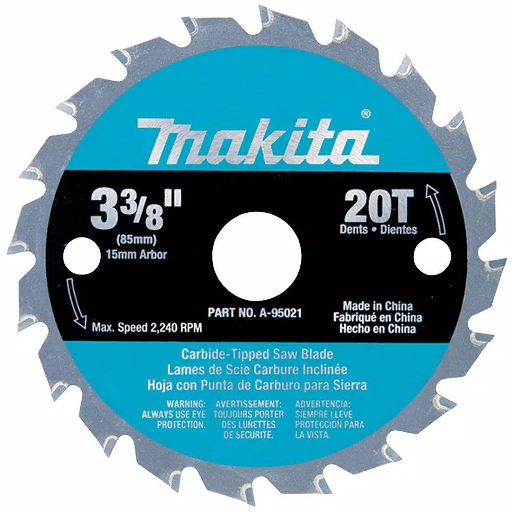 The Makita 3-3/8 in. Carbide-Tipped Circular Saw Blade has an efficient 20 tooth design. The blade is expertly tensioned and engineered for true cuts. The carbide tooth design is engineered for quality cuts and longer life. For use with Makita SH01W cordless circular saw.
