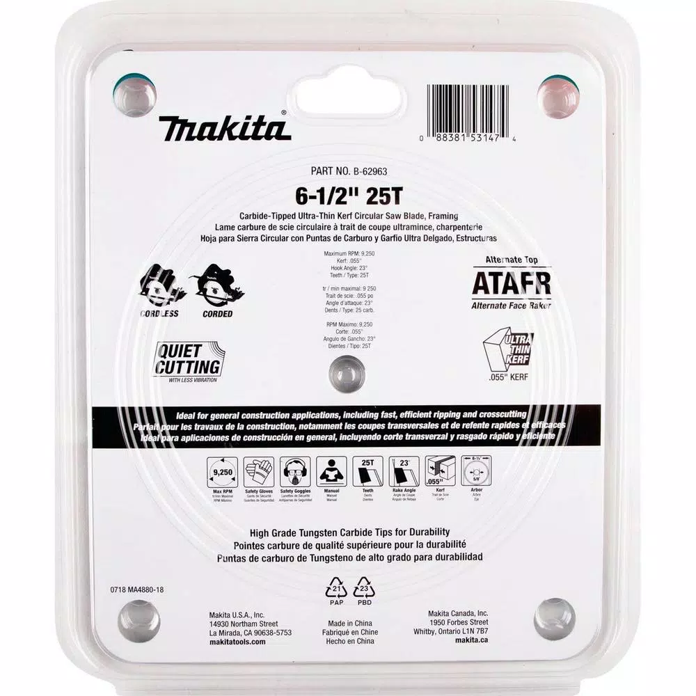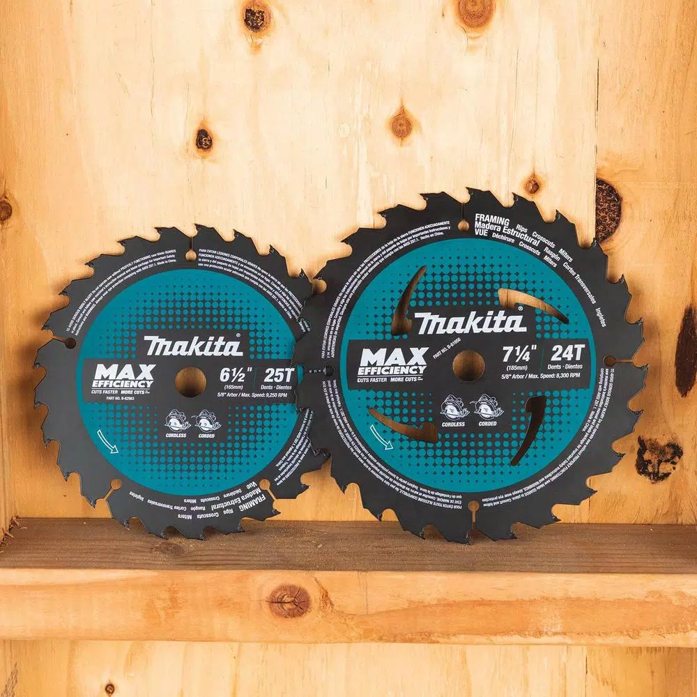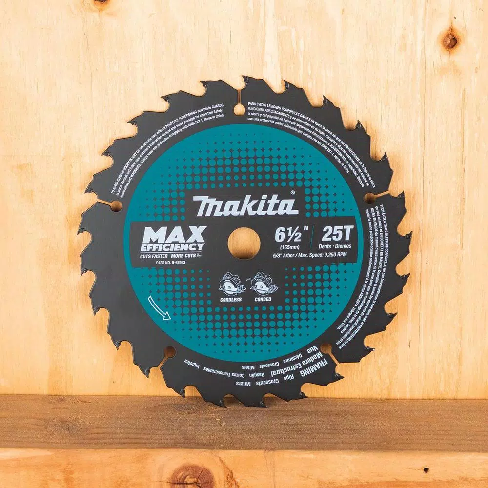 The Makita 6-1/2 in. 25T Carbide-Tipped Max Efficiency Ultra-Thin Kerf Circular Saw Blade is engineered for use with cordless circular saws, and is ideal for a full range of wood cutting applications. The ultra-thin kerf design (only 0.055 in.) and specially engineered blade teeth assist in reducing the load put on the tool while cutting. In addition, the reduced swing width allows for smoother material removal with less cutting resistance. The result is increased cutting efficiency and up to 25% more cuts per charge compared to standard blades. The high grade Tungsten Carbide tips are engineered for improved durability and longer blade life, and the special ATAFR (Alternate Top Alternate Face with Raker) carbide tips provide smoother and faster cuts. This saw blade is for use with 6-1/2 Cordless Circular Saws with 5/8 arbor (models XSS01Z and XSH03M, sold separately).
