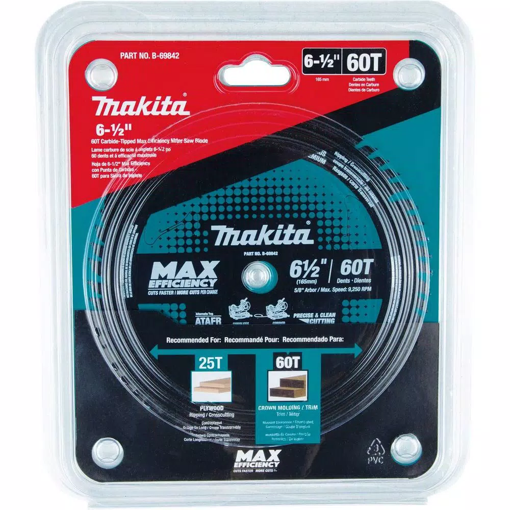 The Makita 6-1/2 in. 60T Carbide-Tipped Max Efficiency Miter Saw Blade is designed to make precision cuts in a variety of wood material. The blade is expertly tensioned for precision and true cutting. Manufactured from high quality steel for added durability throughout the life of the blade. Max Efficiency accessories are engineered to deliver optimal run times and performance. With Max Efficiency, users get more cuts per charge over standard blades.