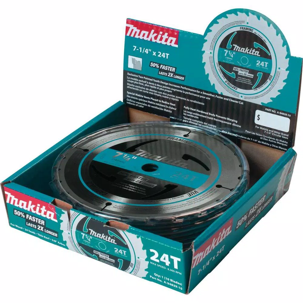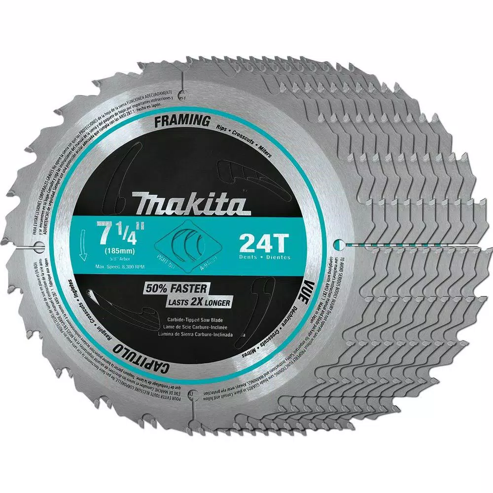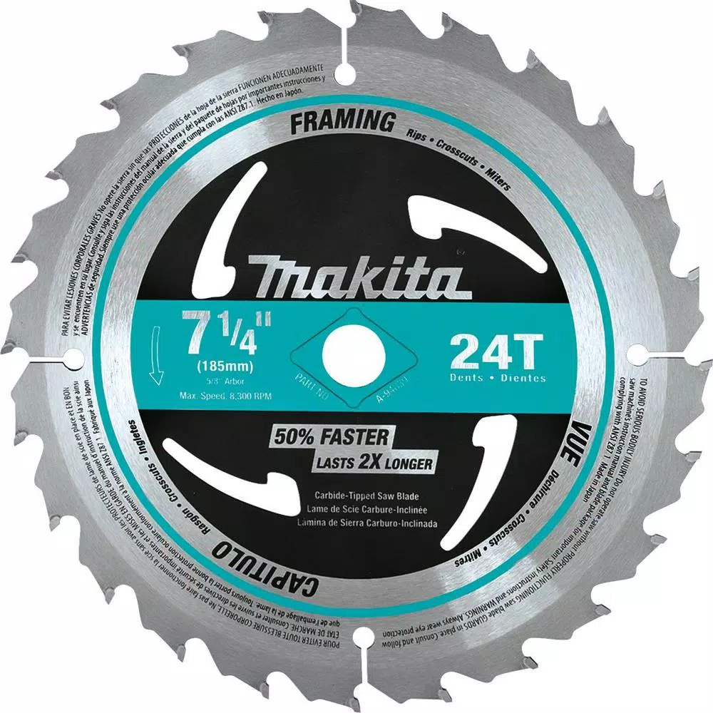 The Makita 7-1/4 in. Framing Blade has an efficient 24 tooth design. The blade is expertly tensioned for true cuts. Carbide tooth design for quality cuts and longer life.