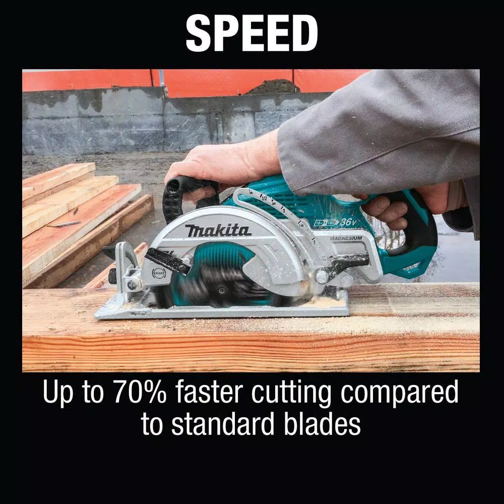 The Makita 7-1/4 in. 24T Carbide-Tipped Ultra-Thin Kerf Framing Saw Blade is ideal for a framers using cordless circular saws for a full range of wood cutting applications. The ultra-thin kerf design (only 0.057 in.) and specially engineered blade teeth to assist in reducing the load put on the tool while cutting, with a reduced swing width that allows for smoother material removal with less cutting resistance. The result is increased cutting efficiency, and users get up to 70% faster cutting and up to 70% more cuts per charge compared to standard blades. The high grade Tungsten Carbide tips are engineered for improved durability and longer blade life, and the special ATAFR (Alternate Top Alternate Face with Raker) carbide tips provide smoother and caster cuts. Added features including a blade coating for reduced pitch build-up.