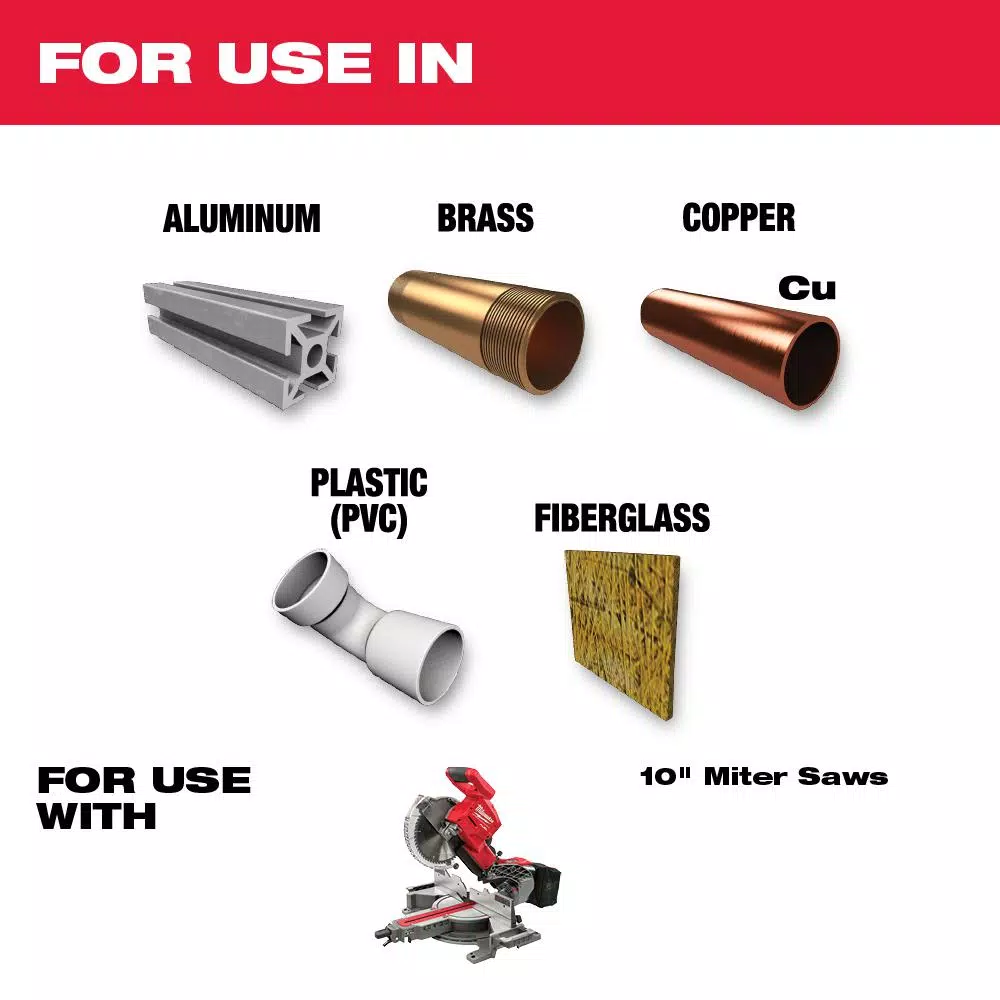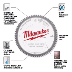 The Milwaukee 10 in. 72T Aluminum Cutting Metal Circular Saw Blades are specifically designed to exceed contractor’s expectations for blade life, cut quality and speed in the most demanding metal cutting applications – without a lubricant. The metal cutting circular saw blades have hand-tensioned hardened alloy steel bodies. This extends blade life and delivers the highest quality cuts available. The blades have Carbide-Tipped Teeth with Alternate Top Bevel grind to shear through metal delivering burr-free, cool-to-touch cuts.