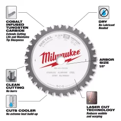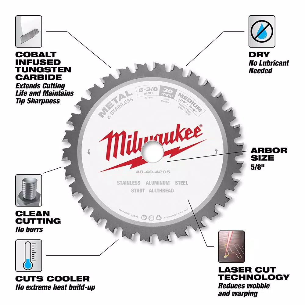 The Milwaukee 5-3/8 in. 30T Metal and Stainless Cutting Circular Saw Blades are specifically designed to exceed contractor’s expectations for blade life, cut quality and speed in the most demanding metal cutting applications – without a lubricant. The metal cutting circular saw blades feature hand-tensioned hardened alloy steel bodies. This extends the user’s blade life and delivers them the highest quality cuts available. The blades feature Carbide-Tipped Teeth with Alternate Top Bevel grind enabling users to shear through metal delivering you burr-free, cool-to-touch cuts.