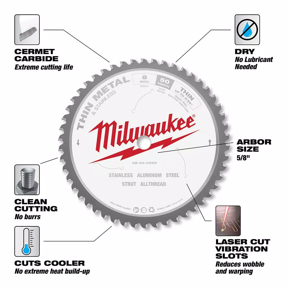 The MILWAUKEE® 8″ 50T Metal & Stainless Cutting Circular Saw Blades are specifically designed to exceed contractor’s expectations for blade life, cut quality, and speed in the most demanding metal cutting applications – without a lubricant. The metal cutting circular saw blades feature hand-tensioned hardened alloy steel bodies. This extends the user’s blade life and delivers them the highest quality cuts available. The blades feature Cermet-Tipped Teeth with Alternate Top Bevel grind enabling users to shear through metal delivering you burr-free, cool-to-touch cuts.