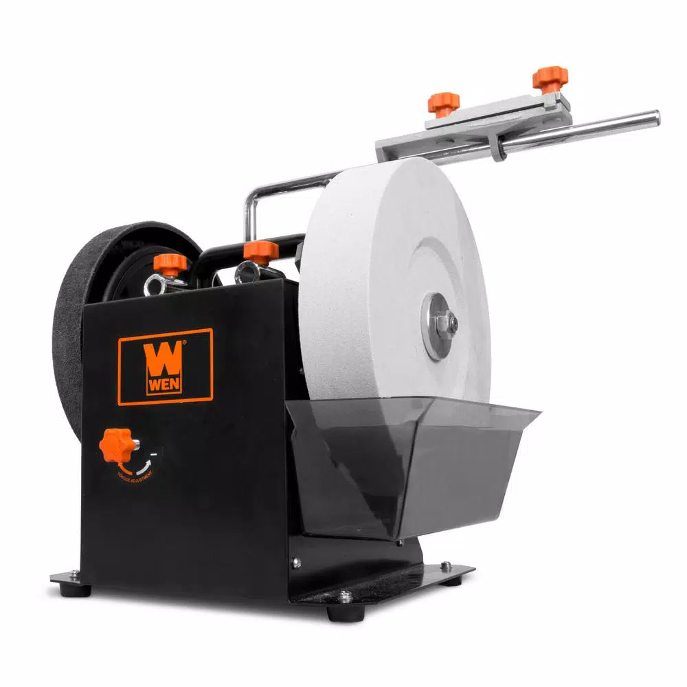 Remember when your blades stayed cool. Stop your blades from overheating with the WEN 10 in. Water-Cooled Wet and Dry Sharpening System. Boasting a 10 in. x 2 in. 220-Grit wet sharpening stone and an 9 in. by 1-3/16 in. leather stropping wheel, you’ll have everything you need to bring old dull tools and knives back to life. The 1.25 Amp induction motor quietly rotates the wheels at 120 RPM for maximum precision during operation. Once the edge is nice and sharp, polish and finish the surface on the leather stropping wheel. Resuscitate dull blades, wood chisels, carving tools, scissors, screwdrivers, lathe tools, axes and more. The universal support bar adjusts to both horizontal and vertical positions, with a fine-tune adjustment ring for ultra-precise adjustments. The bars 12 mm Dia allows for compatibility with the majority of sharpening accessories on the market, including the WEN 42704A 4-Piece Sharpening Kit. The WEN 10 in. Wet/Dry Sharpener also includes an angle guide, an onboard carrying handle, a height adjustable water reservoir and a plane jig. And, because its a WEN product, your 10 in. Wet and Dry Sharpening System comes backed by a 2-year warranty, a nationwide network of skilled service technicians and a friendly customer phone line. Remember when your knives could cut through anything. Remember WEN.