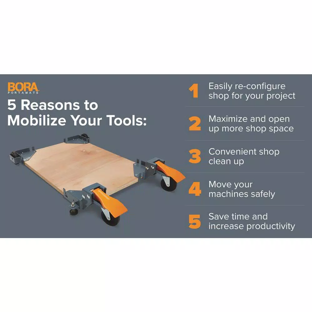 With the PM-1100 Customizable Mobile Base, it’s never been easier to move equipment around a crowded shop. It lets you keep stationary equipment out of the way until needed, freeing space for large projects and cleaning. This fully customizable mobile base uses corner wheel pieces with pre-drilled holes to ensure it fits your machine perfectly. Move jointers, band saws, lathes, table saws, sanders, drill presses, planers, workbenches, and much more.