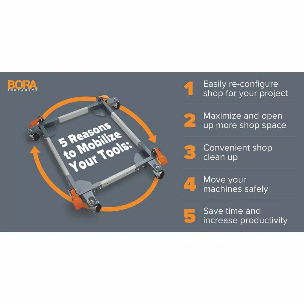 With the BORA PORTAMATE PM-2500 universal mobile base, it’s never been easier to move equipment around a crowded shop. This fully adjustable mobile base features side rails and corner pieces with holes spaced every inch to insure the perfect fit for your machine. Move band saws, table saws, sanders, drill presses, jointers, planers and much more. You’ll be able to open up space for more effective productivity, better organization safety and added convenience during cleanup. This base to fit almost any large woodworking machine, forming squares from 12” by 12” to 36” by 36” and rectangles up to 20” by 52”. There are predrilled holes in 1-inch increments that allow you to choose the shape you need. 3-inch ball bearing wheels at each corner makes it easy to maneuver. The heavy-duty steel foot-operated levers lock machines to the floor during use and are auick to activate for mobility. The PM-2500 has a maximum weight capacity of 650 lbs. All parts are included, and it’s backed by a one-year limited warranty.