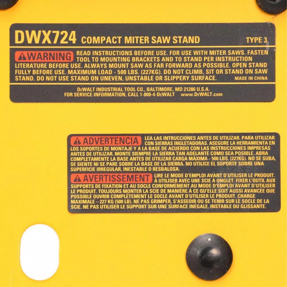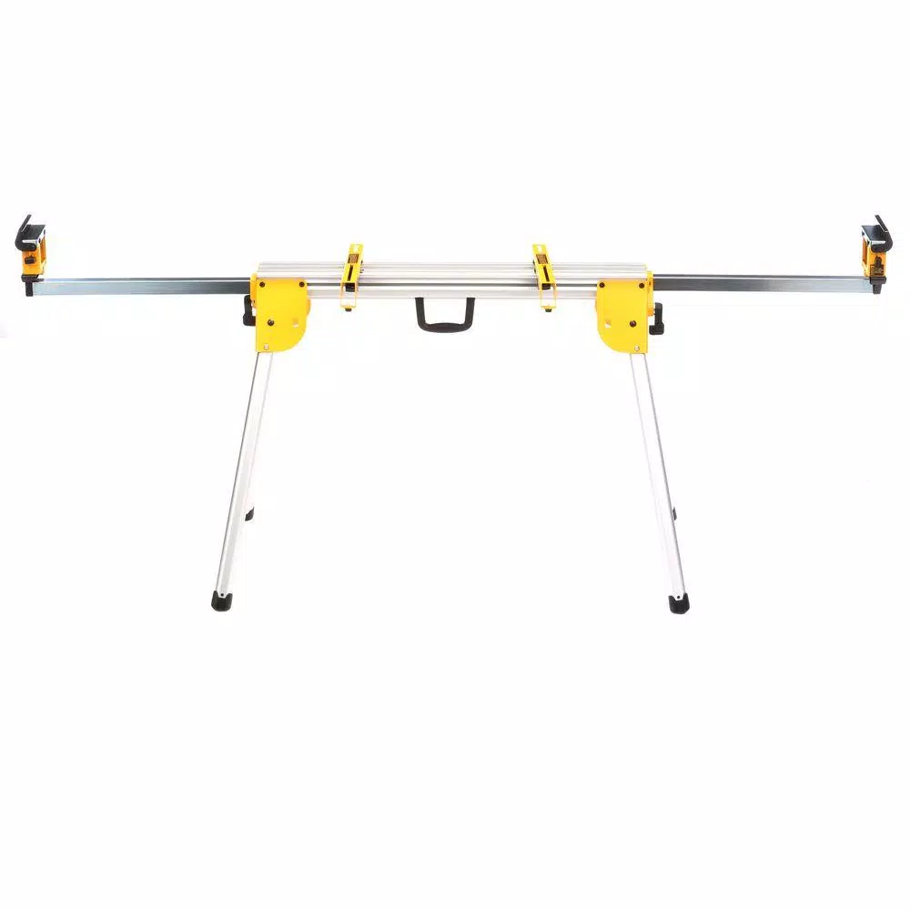 The DEWALT Compact Miter Saw Stand has a universal design that works with all brands of miter saws. Made of lightweight aluminum construction, it weighs only 29.8 lbs. for easy transport to and from the job site with folding legs. It’s also extremely durable. The 40-Inch beam extends to support up to 10 feet of material and up to 500 lbs. Work stops and supports can be repositioned quickly anywhere along the rail.