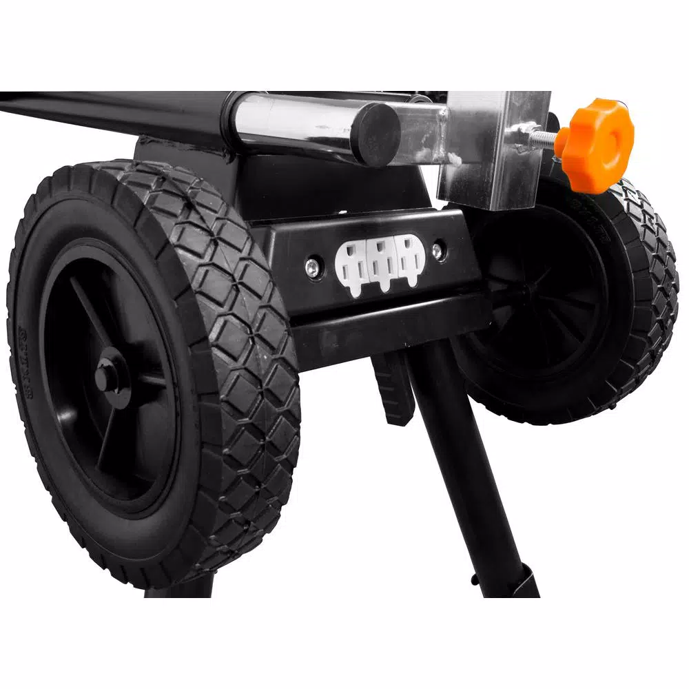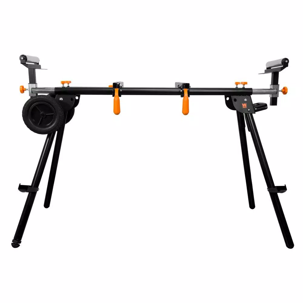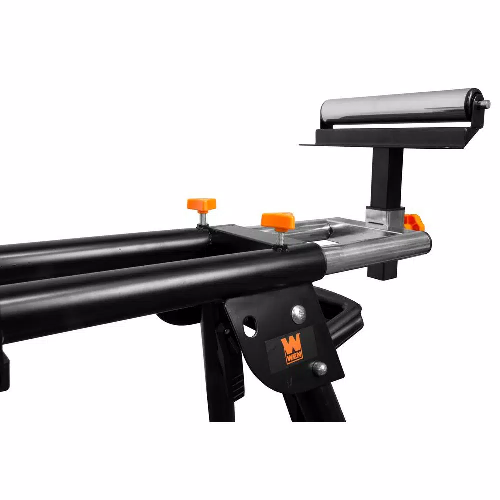 Remember when you could adequately support both your miter saw and your workpiece. With the WEN Collapsible Rolling Miter Saw Stand, you’ll have a sturdy and reliable support system for all your sawing needs. 3 pre-mounted 120-Volt outlets provide you up to 15 Amp of power, meeting the needs of saws and tools of all sizes. Two 8 in. never flat wheels combine with foldable design for a safe and easy transportation and storage solution. The sliding arms extend anywhere from 32 in. to 79 in. W, providing support for boards up to 10.5 ft. L. Quick-release brackets tightly lock the miter saw in place for simple installation and adjustments. The 1-1/2 in. Dia steel frame provides over 330 lbs. of support to your saw and materials while the powder-coated finish prevents corrosion and marring to the stands body. Adjust the height of the detachable rollers to best match the specific requirements of your project. Both rollers also operate as work stops, helping make consistent and even cuts every time. The universal design allows for compatibility with the majority of miter saws on the market, including the entire WEN miter saw series. If you want to know whether or not your particular miter saw will fit onto the WEN Rolling Miter Saw Stand, simply measure the distance between the front and back mounting holes. If this distance is less than 15 in. and on a centerline, the stand will fit. Backed by a 2-years warranty.